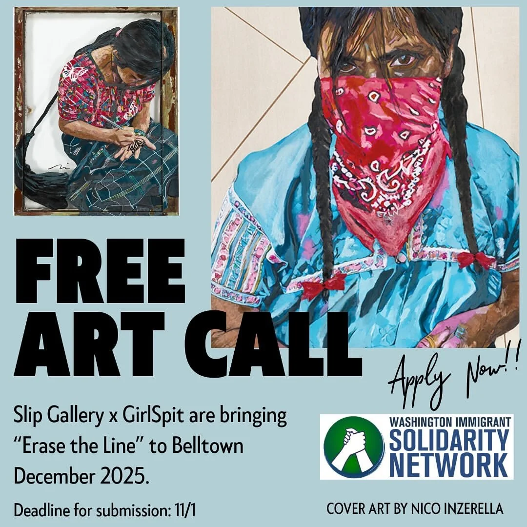 We are inviting artists in all mediums to submit work for Erase the Line, a show dedicated to raising funds and awareness for immigrant justice. Slip gallery never takes a commission of sales. 70% of art sales will go to the exhibiting artists, and 30% of all sales will be donated directly to Washington Immigration Solidarity Network @waisn_org supporting legal defense and community resources for those impacted by immigration enforcement.